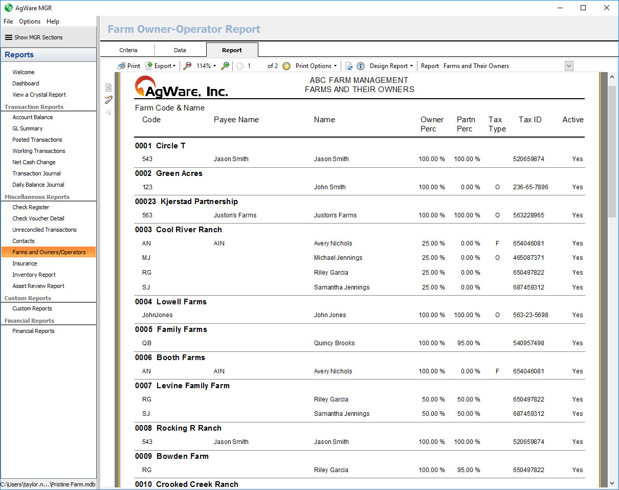 The farms and their owners report shows a list of the selected farms and their owners grouped by farm and sorted by owner code. It also shows additional ownership information such as the ownership percentage, participation percentage, tax types, tax id for the owner, and status.