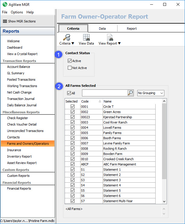 The Farms and Owners/Operators report section contains four system reports: Farms and Their Operators, Farms and Their Owners, Operators and Their Farms, and Owners and Their Farms. The criteria screen for the farms and owners/operators section has a contact status option (1) and a farm selector (2).