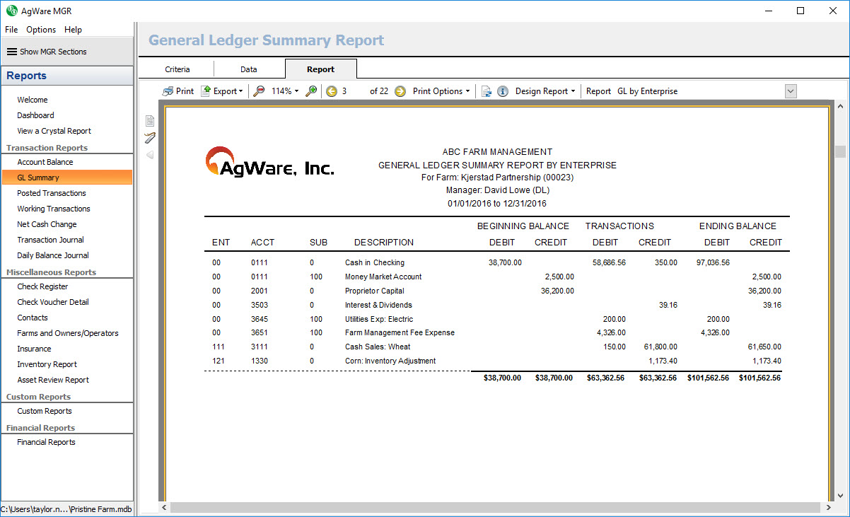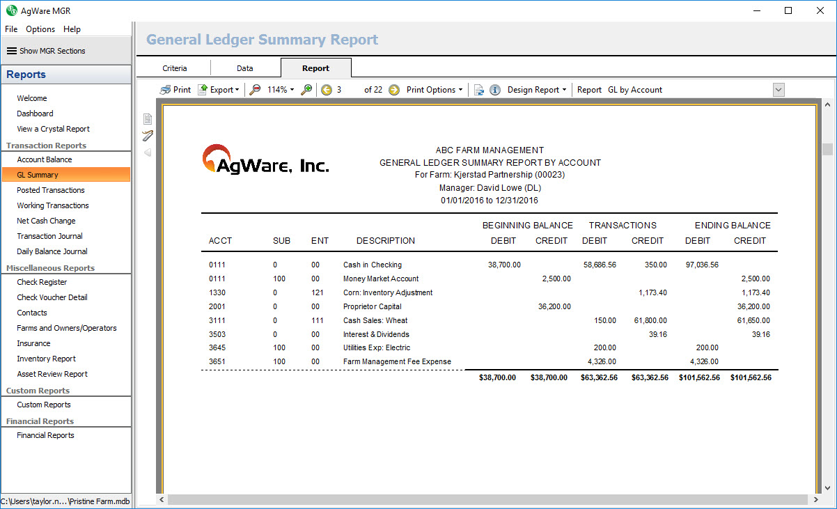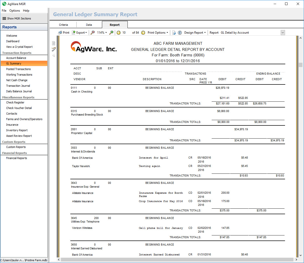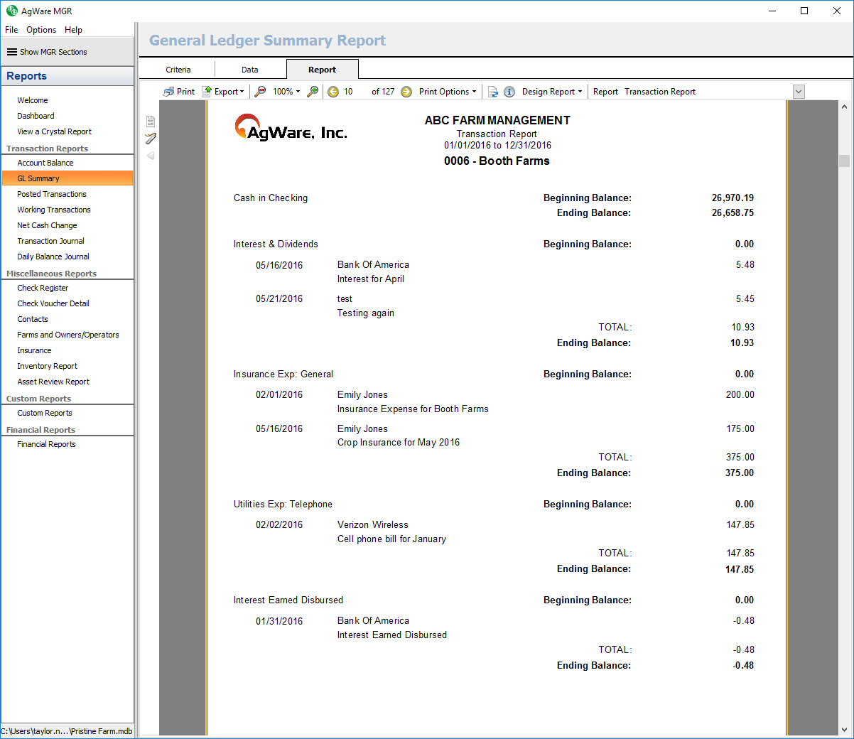 The transaction report shows a listing of all GL accounts with activity and their posted transactions for the given date range sorted in order of farm, statement type, normal balance, and account code. It also shows the beginning and ending balance for each GL account listed.