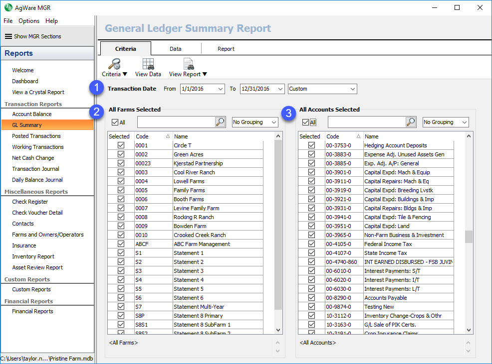 The GL Summary report section contains four system reports: GL by Account, GL by Enterprise, GL Detail by Account, and Transaction Report. The criteria screen for the GL summary reports contains transaction date selectors (1), a farm selector (2), and a GL account selector (3). You’ll choose the desired from date and to date (you can also use the date range drop down that will auto fill the from and to dates). Then, you’ll select your farms and GL accounts. All of the GL Summary reports contain posted transactions; working transactions are excluded from these reports.