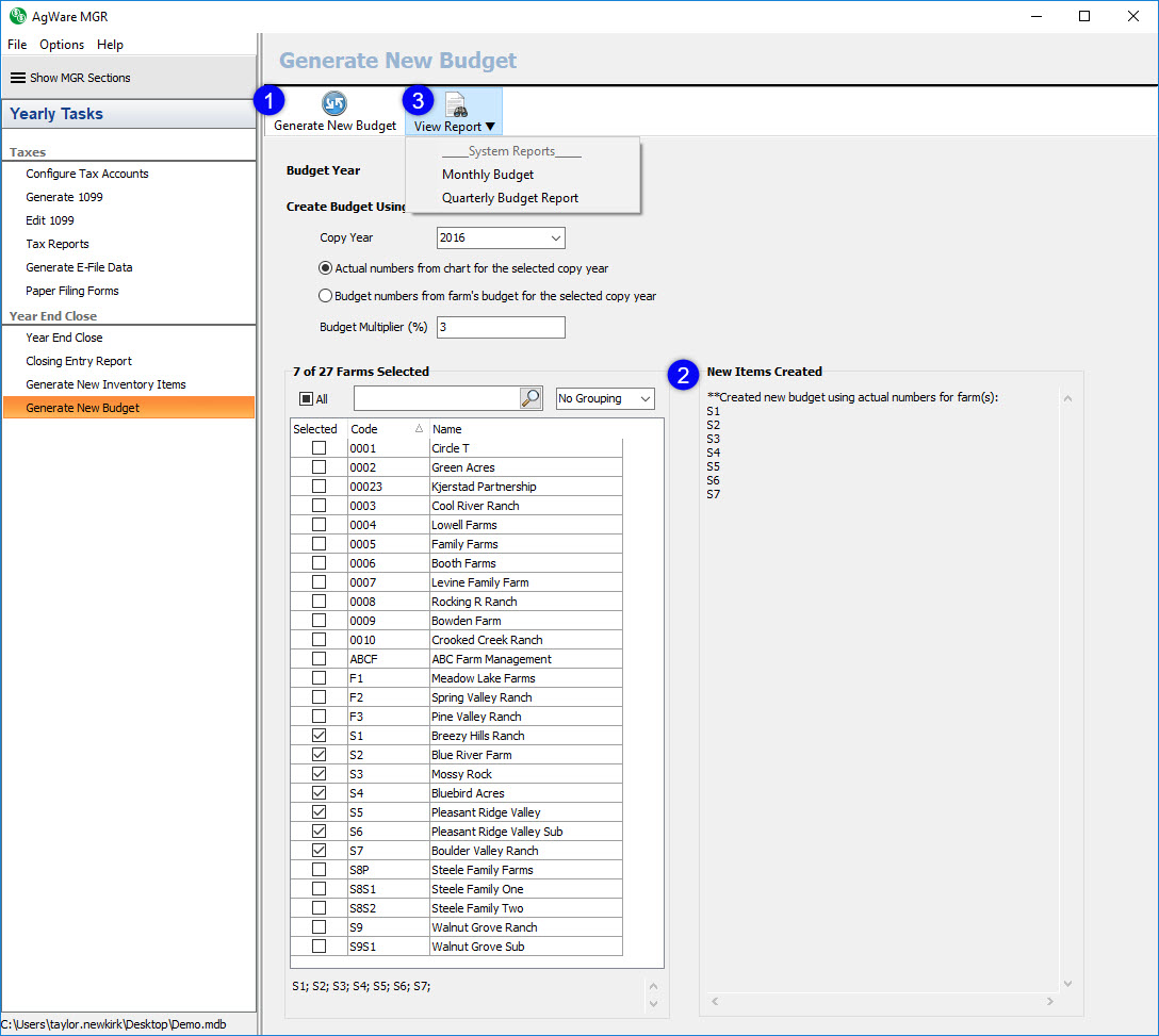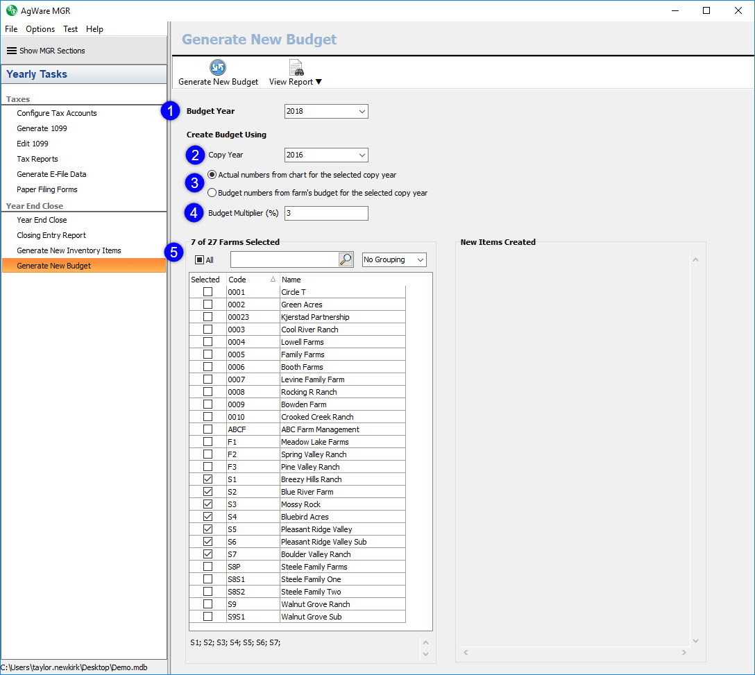 The first step to generate a new budget is to choose the year you would like to create the new budget for using the budget year drop down (1). AgWare allows you to create a budget for the current year, next year, or the year after next. Next, you’ll choose the copy year using the copy year drop down (2). Then, you’ll choose which numbers you would like to copy – the actual numbers or the budget numbers (3) – from the selected copy year. If you choose to copy the actual numbers, you’ll need to make sure to choose a copy year within the selected farm’s fiscal period. Similarly, if you choose to copy the budget numbers and there aren’t any budget numbers for the selected copy year, you will see an error. Next, you’ll enter the budget multiplier into the budget multiplier field (4), if desired. By default, the budget multiplier is zero. If you enter a positive number, the program will increase the copied numbers by the percentage entered; however, if a negative number is entered for the budget multiplier the program will decrease the copied numbers by the percentage entered. The last step is to select the farms you would like to generate the budgets for (5).