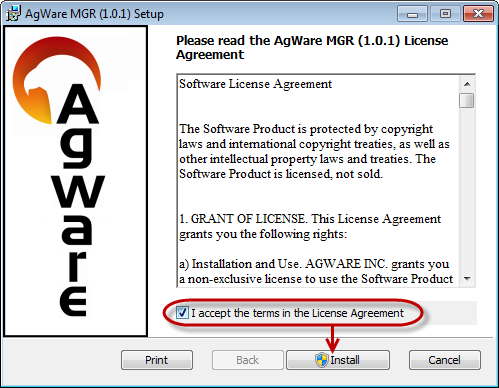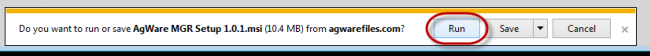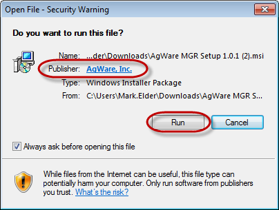 – You may need to confirm your option to let the installer run. If you see a security warning, confirm that the Publisher lists AgWare, Inc. before clicking Run.