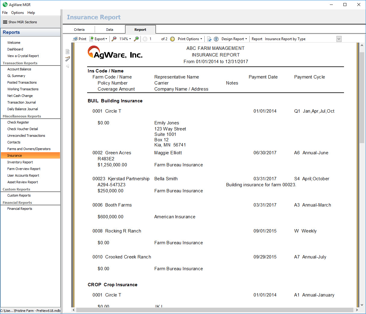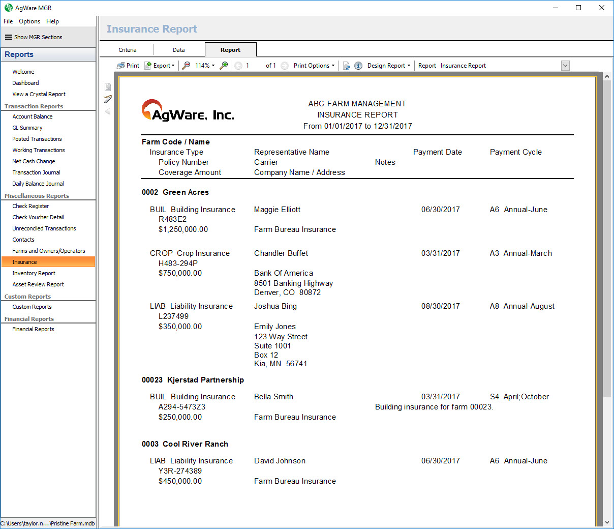 The insurance report by farm shows a listing of all insurance policies for the selected farms whose due date is within the selected date range. Additional information about each policy is shown such as the policy number, coverage amount, carrier name, agent name, due date, etc.