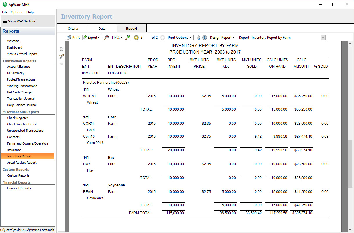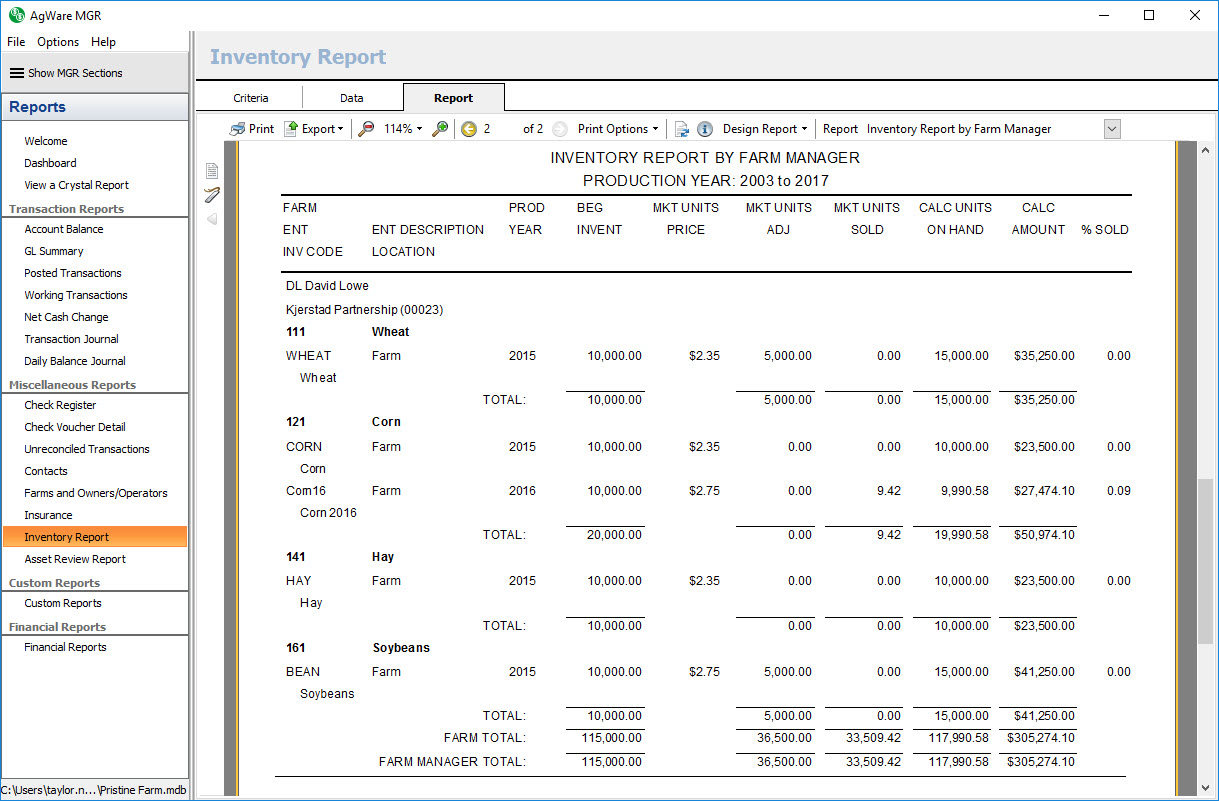 The inventory report by farm manager shows a list of all inventory records for the selected farms and enterprises within the chosen production year range grouped by farm manager and sorted by enterprise, production year, then inventory code.