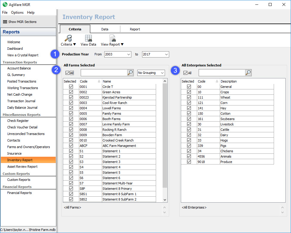 The Inventory Report section contains two system reports: Inventory by Farm Manager and Inventory by Farm. The criteria screen has a production year selector (1), a farm selector (2), and an enterprise selector (3). You’ll choose the desired production year from date and to date, then you’ll select your farms and enterprises. Both inventory reports show the total inventory units and amounts including beginning, sold, and on hand while also showing the sold percentage.