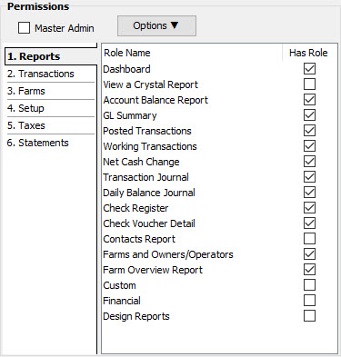Permissions control what sections and actions the user has access to. Each tab in the permissions section correlates to each of the main MGR program sections, and each sub-item on the tab correlates to the sub-sections found on each main program section. The Master Admin checkbox applies all permissions to the selected user. If the users is not a Master Admin, simply check the permissions on each tab that the user should have and hit save. If the Permissions are updated or changed that user will have to sign off and back in for the permissions to take effect.