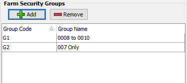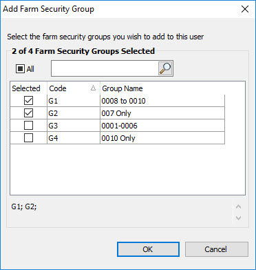 Click on the add button to add a farm security group to the selected user. This will pop up the farm security group selector (shown below); check the desired farm security groups and click OK. You should then see the farm security group(s) in the list on the Maintain User Accounts screen. To remove a farm security group from a user, select it in the grid and click on the remove button. When a farm security group is attached to a user’s account, the user will only be able to access farms within their farm security groups.