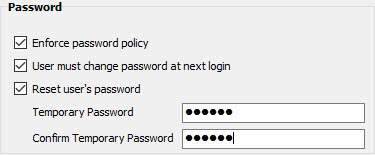 The first checkbox is enforce password policy; when checked this will apply the password policy to the selected user. The password policy is configured in the Setup, User Configuration section of the program. The next checkbox defines whether the user must change their password at the next login. When checked, the next time the user logins in to MGR, they will be prompted to change their password. The box will then automatically uncheck once the user has changed their password. The next checkbox allows administrators to reset the user’s password. When checked, two fields will appear: temporary password and confirm temporary password. The password in each field must match exactly. The password policy is not enforced on temporary passwords. AgWare recommends requiring the user to change their password at next login for situations where a temporary password has been set.