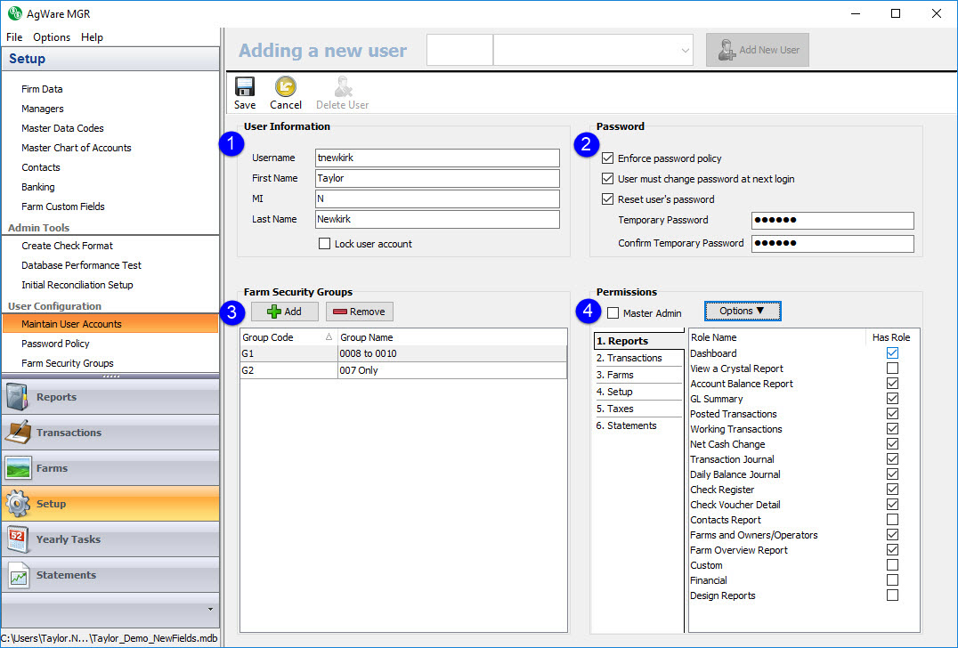 The username is user defined and is unique. This will be the login username for AgWare MGR. The first name and last name fields are required while the middle initial is recommended. MGR uses the first letter of the user’s first name, middle initial, and last name to form the batch id. The lock account checkbox allows administrators to lock user’s accounts. When checked, the user will not be able to login to MGR. Common reasons for locking a user’s account include: no longer employed, or other interoffice issues.