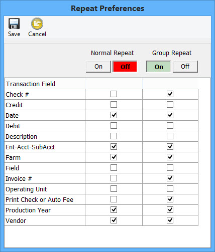The last toolbar button is repeat preferences. In this window you will see repeat preferences for both normal transaction entry mode as well as group transaction entry mode. To turn on/off repeat options for each mode, simply use the on/off toggle button above the appropriate column. Click the desired repeat options to enable them for repeat. Once you have all options chosen, click on the save button. When repeat is on, you will see the repeated field names underlined in the transaction editor.