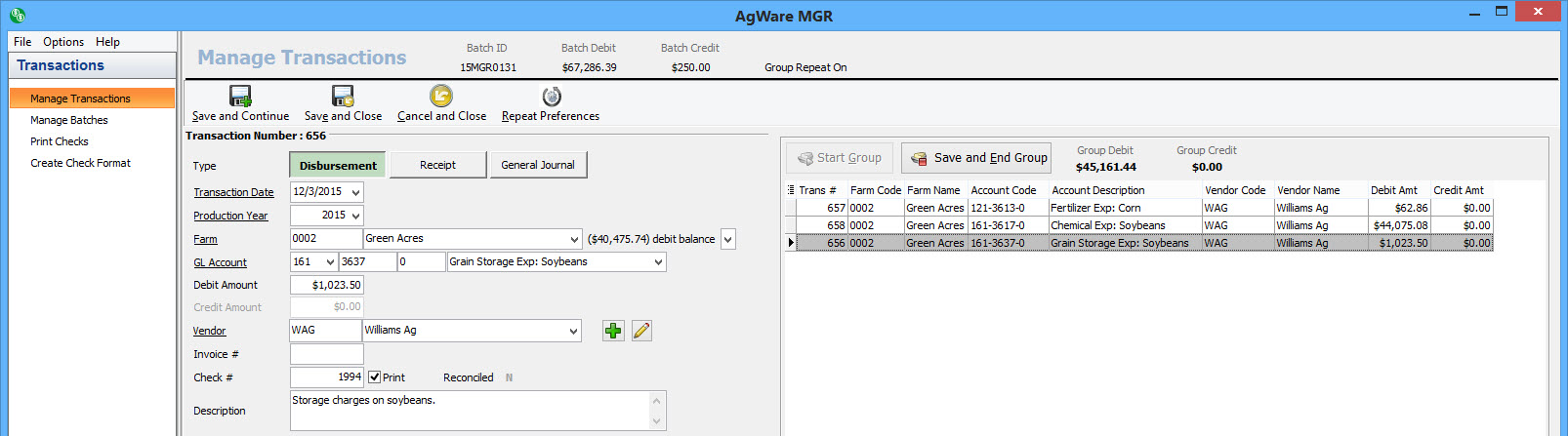 Once you’ve entered a group transaction, you have a few save options: save and continue, save and close, and save and end group. Save and continue will save the current transaction and create a new one in the current group. Save and close will save the current transaction and return to the main manage transactions grid. Save and end group will save the current transaction, end the current group, and start a new single transaction.