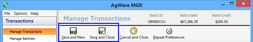 There are two ways to save a single transaction. Save and continue will save the current transaction, and create a new one for entry. Save and close will save the current transaction, close the transaction editor, and return you to the manage transactions window. You can also choose Cancel and Close, this will not save your entered information and will take you back to the manage transactions window.