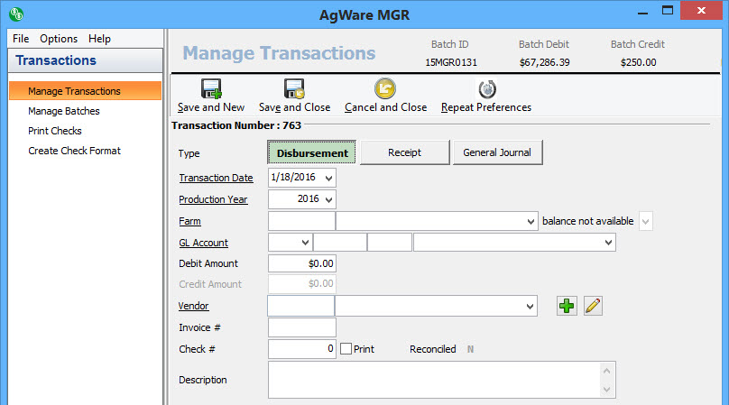 At the very top of the new transaction section, you’ll see the batch id number. This is a unique number created by the software. The first two digits are the year, the next three characters are the user’s initials, and the last four digits are a unique number generated by MGR. You’ll also see the current batch debit and credit amounts. These amounts are the total for the current batch. To the right of the batch debit and credit amounts are the repeat options. When in normal mode, you’ll see “Repeat On/Off” and in group mode you’ll see “Group Repeat On/Off”.