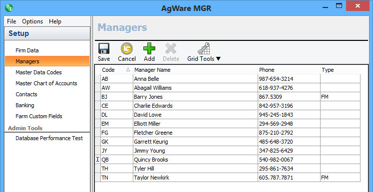 The Manager code is a required field in the edit farm section, and this is a user defined code. A phone number and manager type can be defined, but manager type is informational only. There are many reports and other program sections using the manager code.