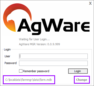 Now, double click on the AgWare MGR icon to open the program. This will bring up the main login screen; you’ll need to verify that the path to your database is correct. This is found at the bottom of the login window (yours may vary from the example below – that’s okay). If it is not correct, simply click on the change button and navigate to the correct database. After you have verified the database is correct, enter your login information (this is the same as your AccuFarm login) and click login. If you received any error when attempting to login to AgWare MGR, please give us a call at 605-791-4872 or email support@agmgr.com.