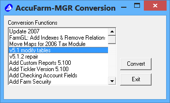 After the AccuFarm install is complete, you’ll need to navigate to the install directory (it will either be in Program Files or Program Files(x86) depending on which location you chose) and run the “Convert.exe”. This will bring up a small window with a list of various conversion functions. You’ll need to run “v5.1 modify tables”; to do this click on it and then click convert. When it is finished you should get a pop up message that says conversion complete. You can now close the Convert.EXE window.