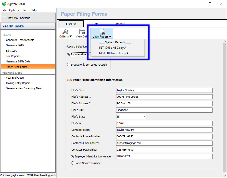 The paper filing forms section contains three tabs: the criteria screen, the data tab, and the reports tab. The first step is to complete the information on the criteria screen. You’ll first choose whether you are generating the forms for all tax records or just the corrected tax records. You’ll then fill out the submission information fields. You can then click on the data tab to review the generated information, or click on the view report button to go directly to a report.