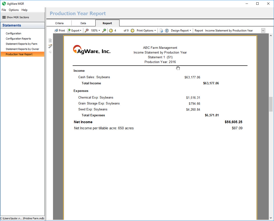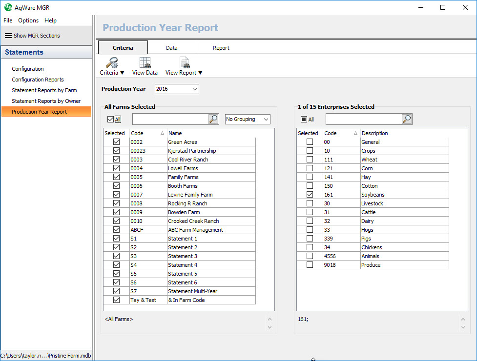 The Production Year Report section is located in the main Statements program section. This section allows users to run statement reports over a selected production year for a selected farm(s) and selected enterprise(s).