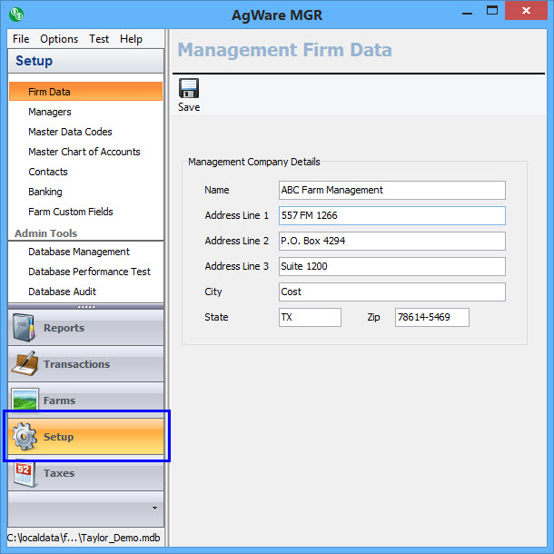 Setup is the fourth navigation item and contains general setup items such as master data codes, master chart of accounts, contact, and banking.