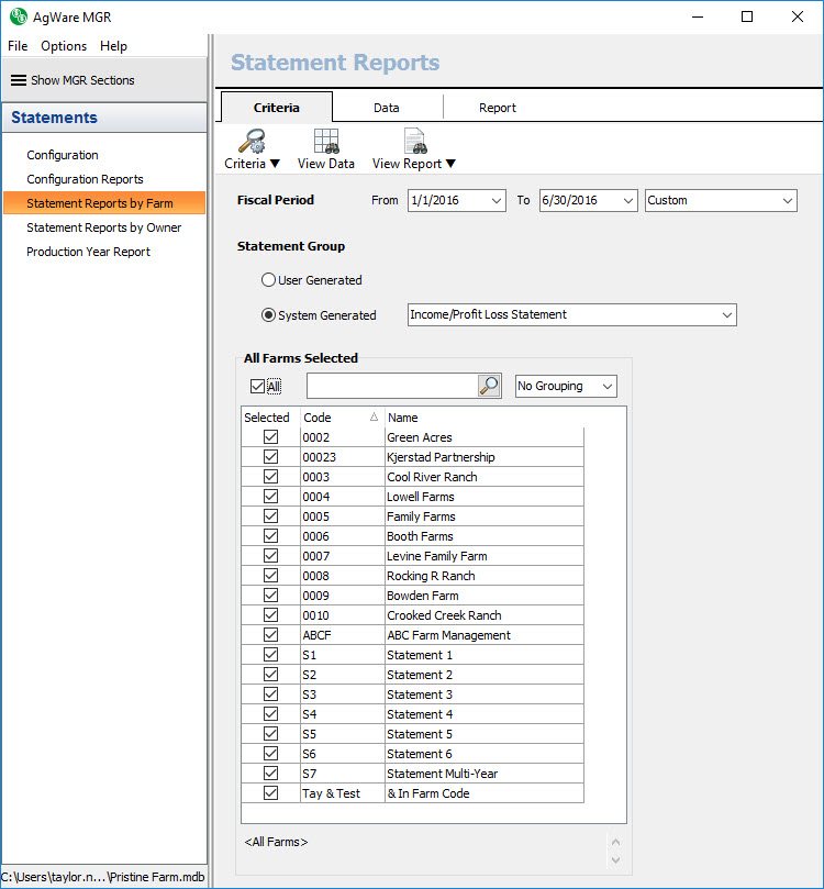 The first thing to choose is the fiscal period. Select the from date and to date. Next, choose either a user generated group (which is configured in the Statements, Configuration section) or choose a system generated statement group. If you choose a system generated statement group, it contains generic statement categories and creates one line item per GL account (that contains a period balance) for the selected owner.