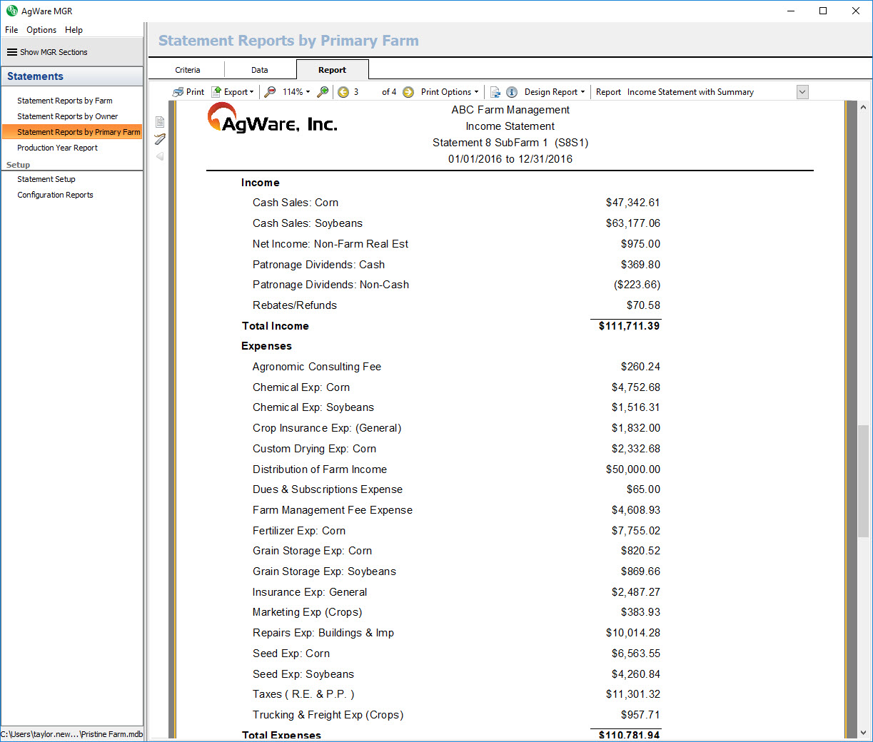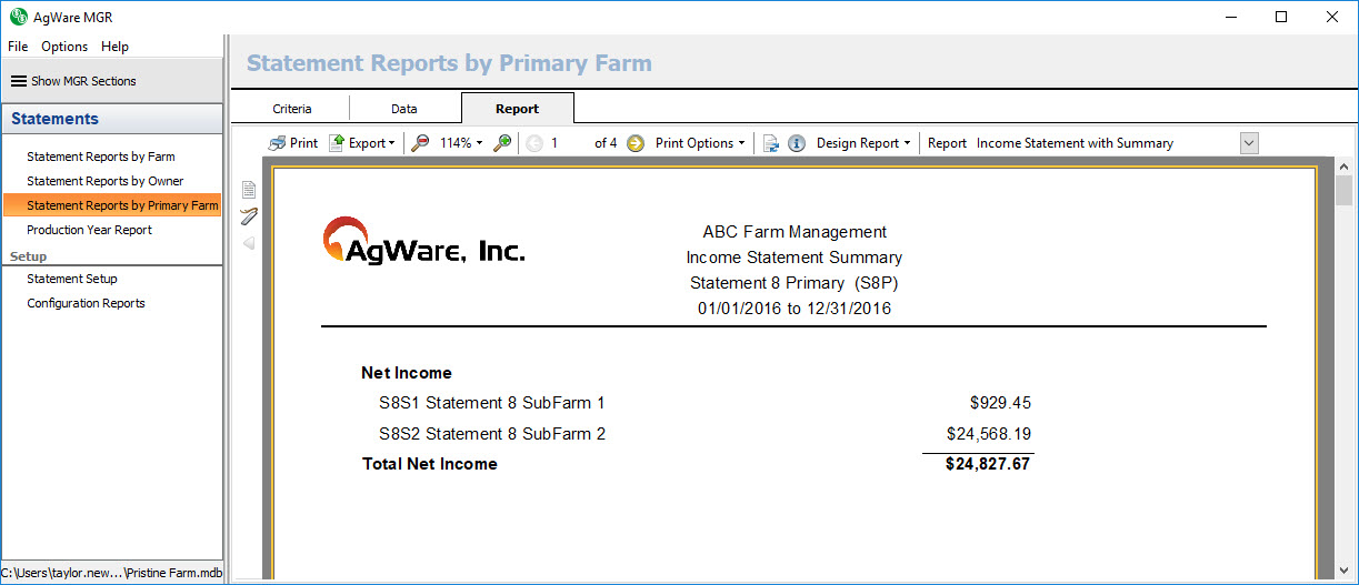 The first thing to choose is the fiscal period; select the from date and to date. Next, choose either a user generated group (which is configured in the Statements, Statement Setup section) or choose a system generated statement group. If you choose a system generated statement group, it contains generic statement groups and creates one line item per GL account (that contains a period balance) for the selected farm. If you choose the Income/Profit Loss Summary Statement system generated group (this was specifically designed for the statement reports by primary farm section) then you will see a summary page printed first. This will contain one net income group and list each sub farm’s net income. Then, pages two on will contain the detailed income statement for each sub farm. Finally, you’ll select the desired farms in the farm selector. You’ll notice that only primary farms are available in the farm selector; the program will automatically include any sub farms with the selected primary farm. Next, choose whether you would like to use the statement copy count found on the farm, management tab. When checked, the program will generate “#” amount of copies for the farm. For example, if farm 00023 has a statement copy count of four, then the program will generate four copies of the statement for farm 00023.