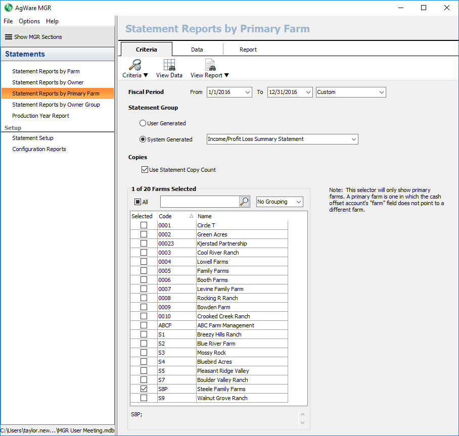 The Statement Reports by Primary Farm section is located in the main Statement program section. This section allows users to run statement reports, both system generated and user generated, over a selected fiscal period and selected primary farm(s).