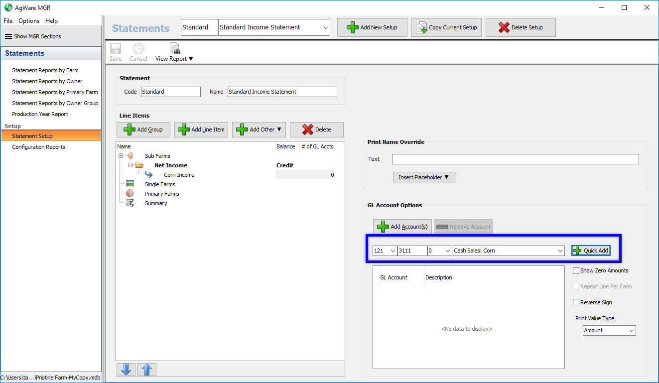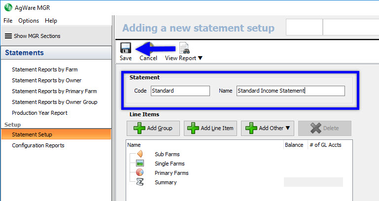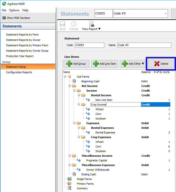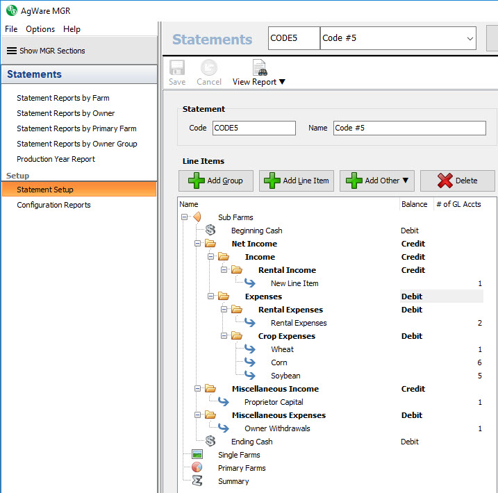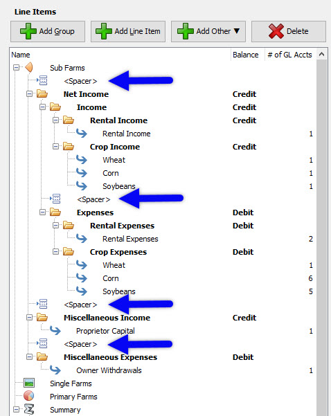 There are four default root items in the line tree setup – sub farms, single farms, primary farms, and summary. The sub farms root item will contain the layout for sub farm setup, the single farms root item will contain the layout for single farms, the primary farm root item contains items you would like to summarize on your primary farm statement such as total crop income for a primary farm’s sub farms, and the summary root item is used for summarizing items at the owner group level.