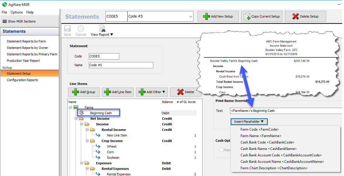 For each item in your statement setup, you have the option to override the printed text by utilizing the print name override options. These options include inserting the farm code, farm name, bank code, or bank name into the printed text. There is also the option to use the farm’s chart description for the printed text. You can use any combination of these five options, as well as entering any additional text you may want. If anything is entered into the print name override text box, it will completely override the display text you entered in the line tree.