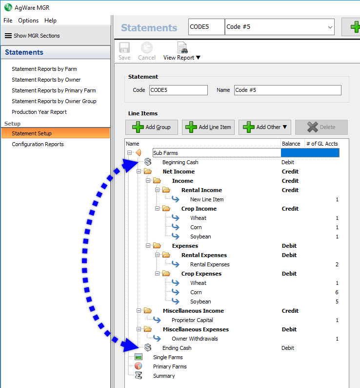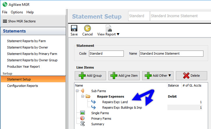 AgWare is using a folder tree layout for the groups and line items with the groups being represented as folders, while the line items display the balance contained in the attached GL account(s). The order that the items appear in the setup tree is the order they will be printed on the statement report. You can drag and drop items to rearrange them in the tree, or use the sort order buttons located below the setup tree.