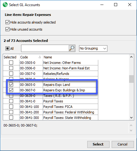 The import GL accounts button allows you to import one line item per selected GL account within the selected group (either an existing group or under one of the default root groups). Simply click the button to pop up the GL account selector, choose the desired GL accounts to add, and then click the select button. You will then see one line item added for each GL account selected, and the GL account will automatically be attached to the line item. You’ll then need to configure the various line item options as mentioned above.