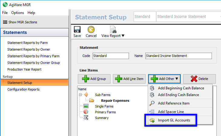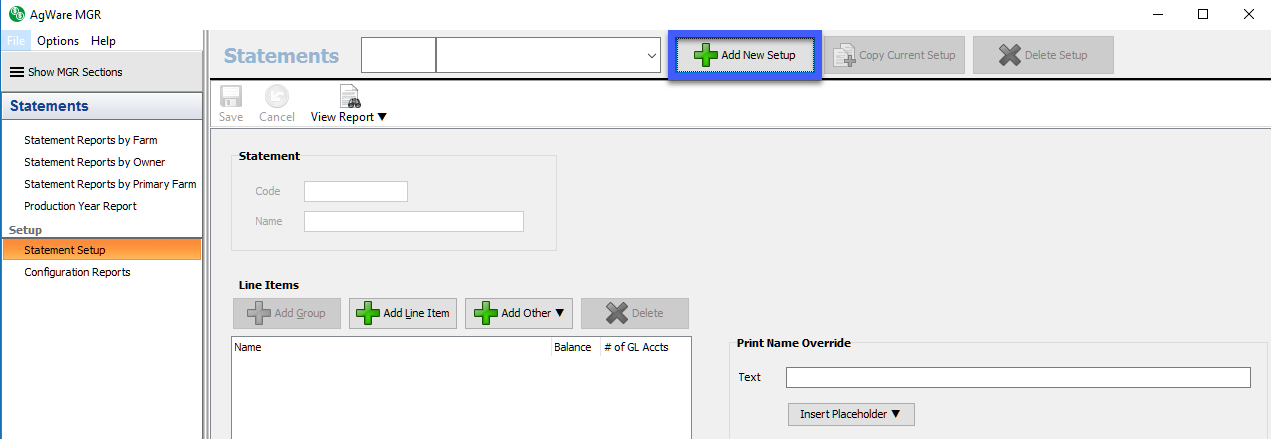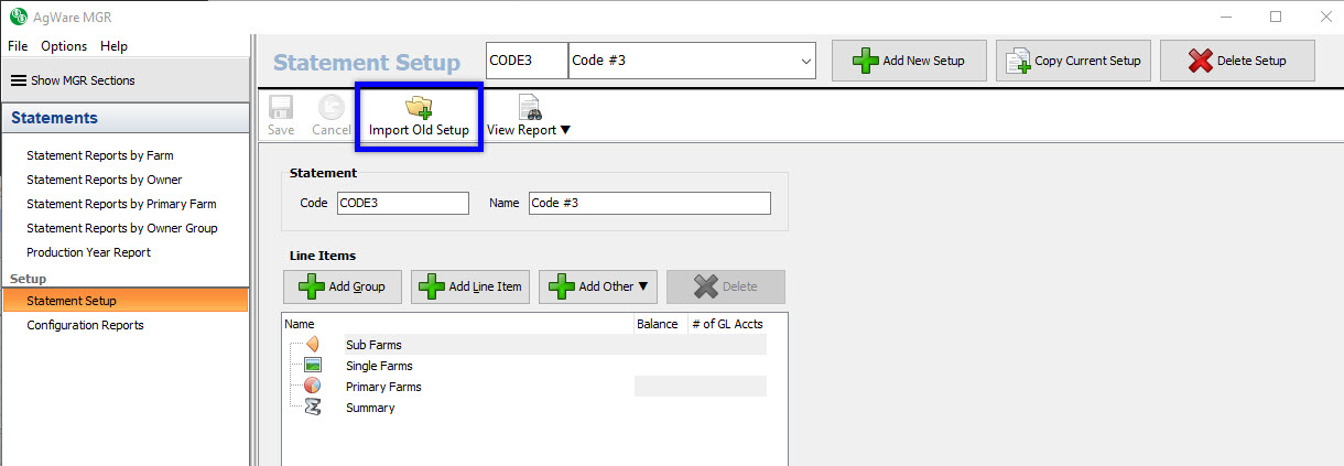 If you previously setup any AgWare statement configurations, we have added a simple import option for you. You’ll choose your statement configuration from the drop down selector at the top of the screen, and click the Import Old Setup toolbar button. This will take your previous AgWare statement configuration and convert it to the new format. However, you will still need to configure each of the options for the groups and line items. You can then repeat this process for each statement configuration you have. This import option only applies to AgWare statements. It will not convert AccuFarm statement files into our format.