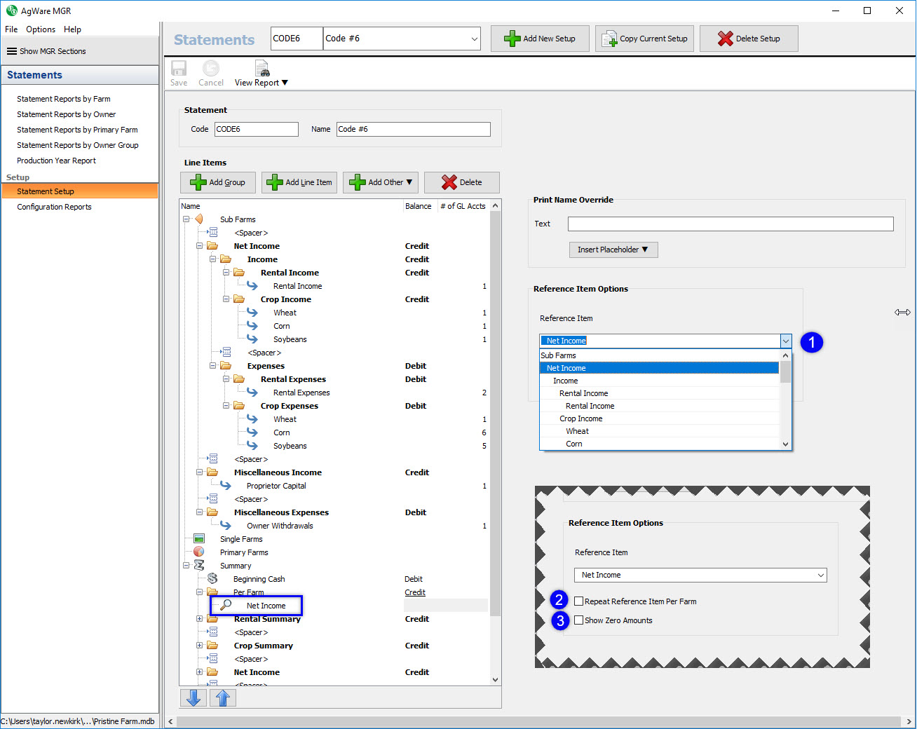 Reference items are line items that point to a group or line item higher in the setup tree, and displays the balance of the referenced item. Once you add the reference item, you’ll then need to choose the item to reference in the drop down list (1). The repeat per farm option (2) only applies to those items contained in the Primary Farms or Summary default root groups. When set, it will repeat the cash balance line item for each farm or sub farm. You can also choose to show the reference item even if the dollar amount is zero by checking the show zero amounts option (3).