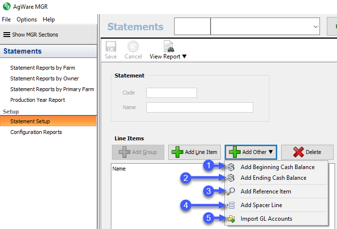 There are five special line item types under the Add Other button: (1) Add Beginning Cash Balance, (2) Add Ending Cash Balance, (3) Add Reference Item, (4) Add Spacer Line, and (5) Import GL Accounts.