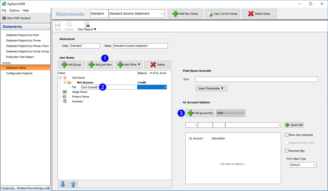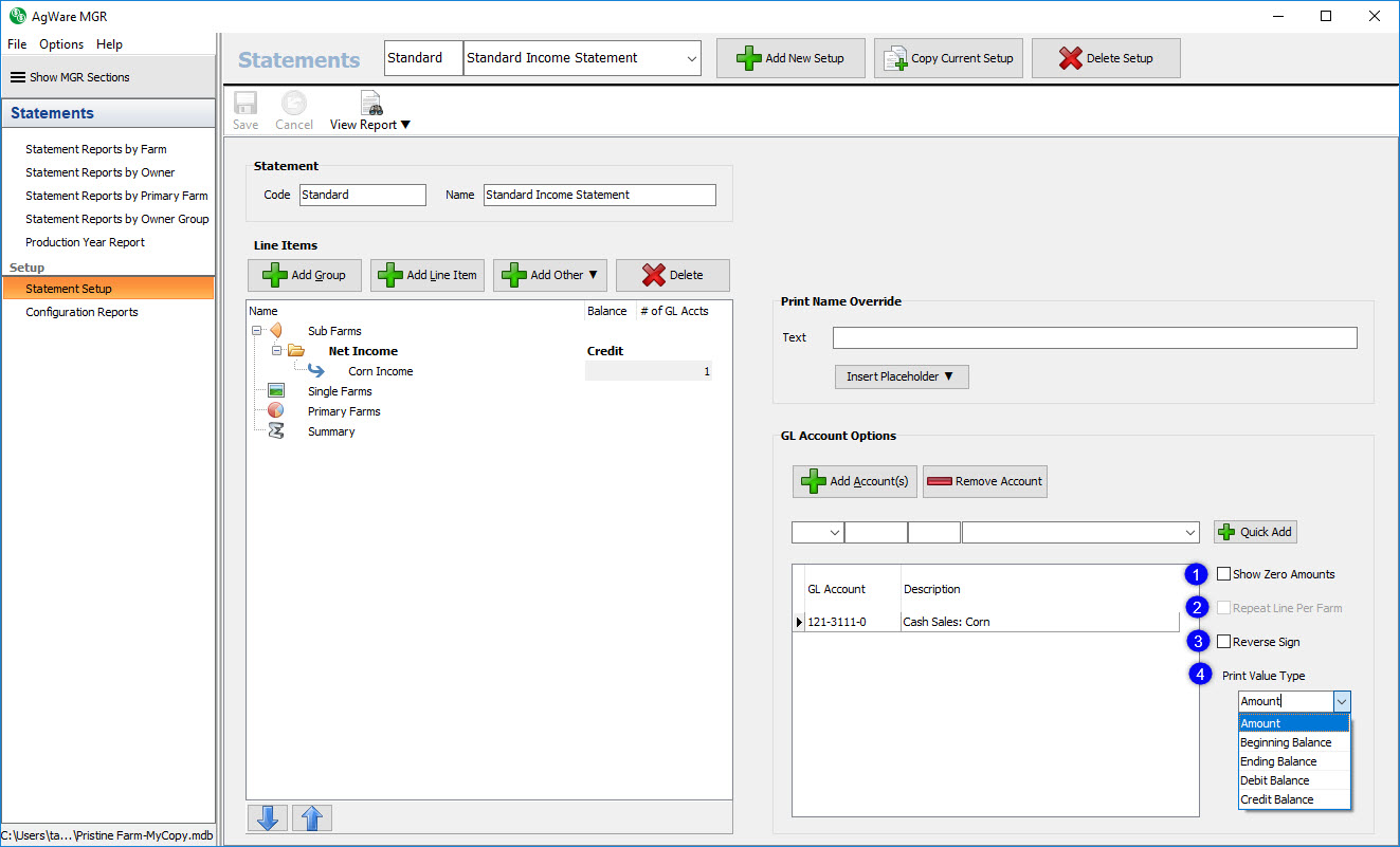There are four additional options to set for each line item: show zero amounts (1), repeat per farm (2), reverse sign (3), and print value type (4). When the show zero amounts option is checked, the line item will be printed on the report even if the print amount is zero. The repeat per farm option only applies to those items contained in the Primary Farms or Summary default root groups. When set, it will repeat the current line item for each farm or sub farm. Reverse sign allows you to reverse the sign of the line item so that you can easily print cash flow summaries on your statement report. The print value type allows you to choose which dollar amount is printed for the selected line item; the period amount, beginning balance, ending balance, debit balance, or credit balance. The default value for the print value type is the period amount.