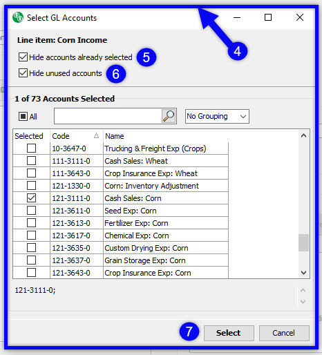 Before adding a line item, you’ll select the desired group to add the line item into. This can either be a group you have added, or you can choose a default root group to insert the line item at the top level. Then, click the Add Line Item (1) button. To set the line item display name, simply click directly on the line item and start typing the desired text (2). Next, click the add GL account(s) button (3) to attach a GL account(s) to the selected line item. This will pop up a GL selector window (4) that allows you to filter the list of GL accounts and select multiple GL accounts at a time. There are two options on this window: you can hide accounts already selected (5) within this statement setup, and you can hide unused accounts (6) by checking the appropriate box at the top of the window. The hide unused accounts option will hide all accounts in the database that are not used on any farm. Once you have selected the desired GL account(s), click on the Select button (7) to add it to the GL accounts grid. You can add as many GL accounts to each line item as needed.