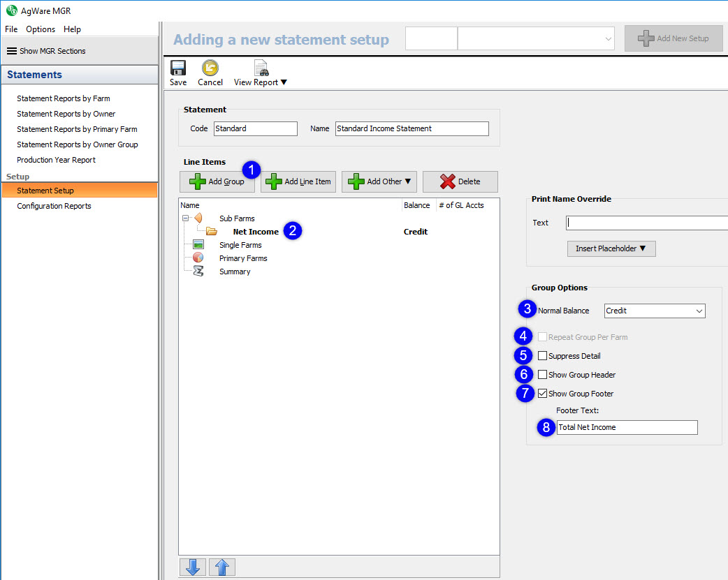 To add a group to your statement setup, select the desired parent group, and click the Add Group (1) button. If this is your first group, select the Sub Farms default root group, and then click the Add Group button. To set the line item display name, simply click directly on the line item and start typing the desired text (2). For each group in your statement setup, there are multiple options to configure. The first option is to choose the normal balance of the group (3). Choose either credit or debit from the drop down. By setting the normal balance, all groups and line items contained within the current group will be combined based on that normal balance. The next option, repeat per farm (4), only applies to those items contained in the Summary default root group. When set, it will repeat the current group for each sub farm. The next option is the suppress detail checkbox (5). When checked, this will suppress all items contained within the group, only printing the group name and a sum of all details contained within the group. If you would like the group header to be printed on the report you’ll check the “Show Header” check box (6) . When printed on the report, the text displayed in the group folder of the setup tree is the text that will be printed. If you would like a group footer to be printed on the report, you’ll check the “Show Footer” check box (7). Once you check the Show Footer box, you’ll see a Footer Text text box (8) appear. You’ll then need to enter the desired footer text to be printed on the report. By default, we set this to Total “Your Group Name Here”. You can change this by deleting the text in the box and typing your desired text. All footers shown on the report will include a sum of the line items contained within the group.