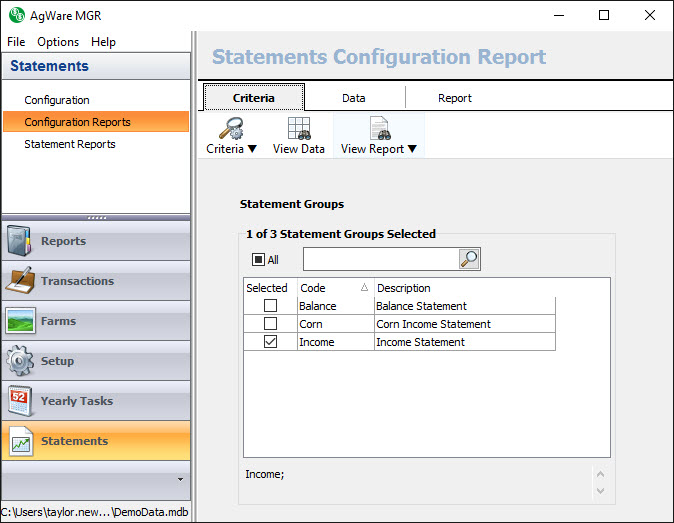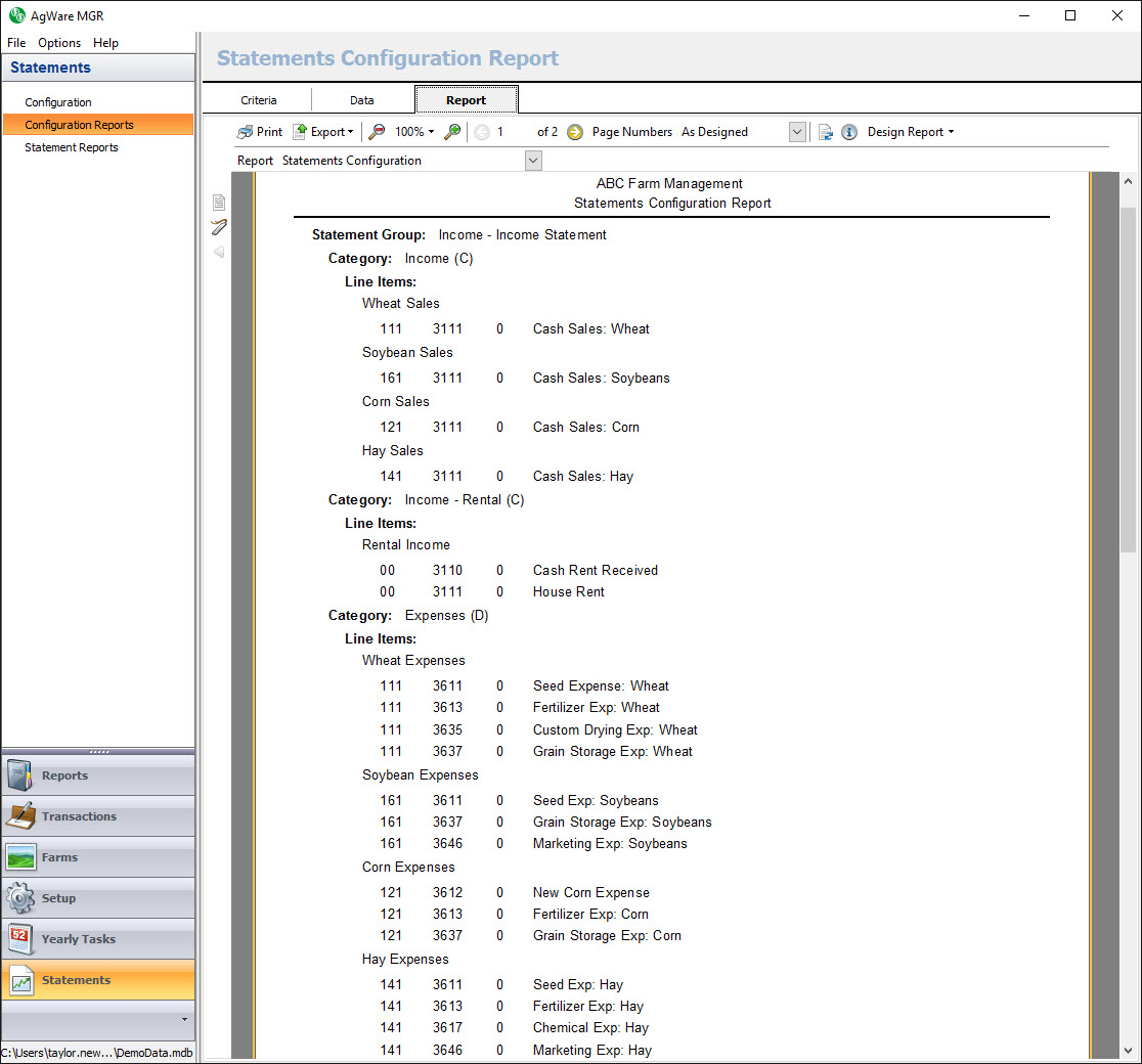 Currently, AgWare offers one system Statement Configuration Report called ‘Statements Configuration’. The report is located in the Statements, Configuration section of the program.