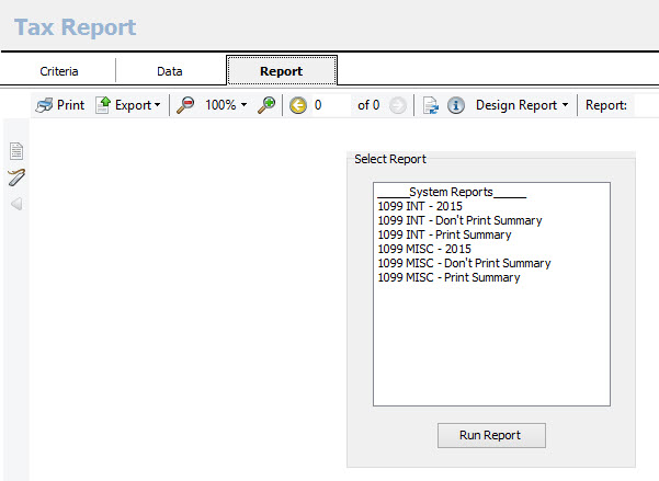 To run a tax report, either click on the report drop down on the criteria tab and choose the desired report, or click on the report tab, highlight the desired report and click run report.