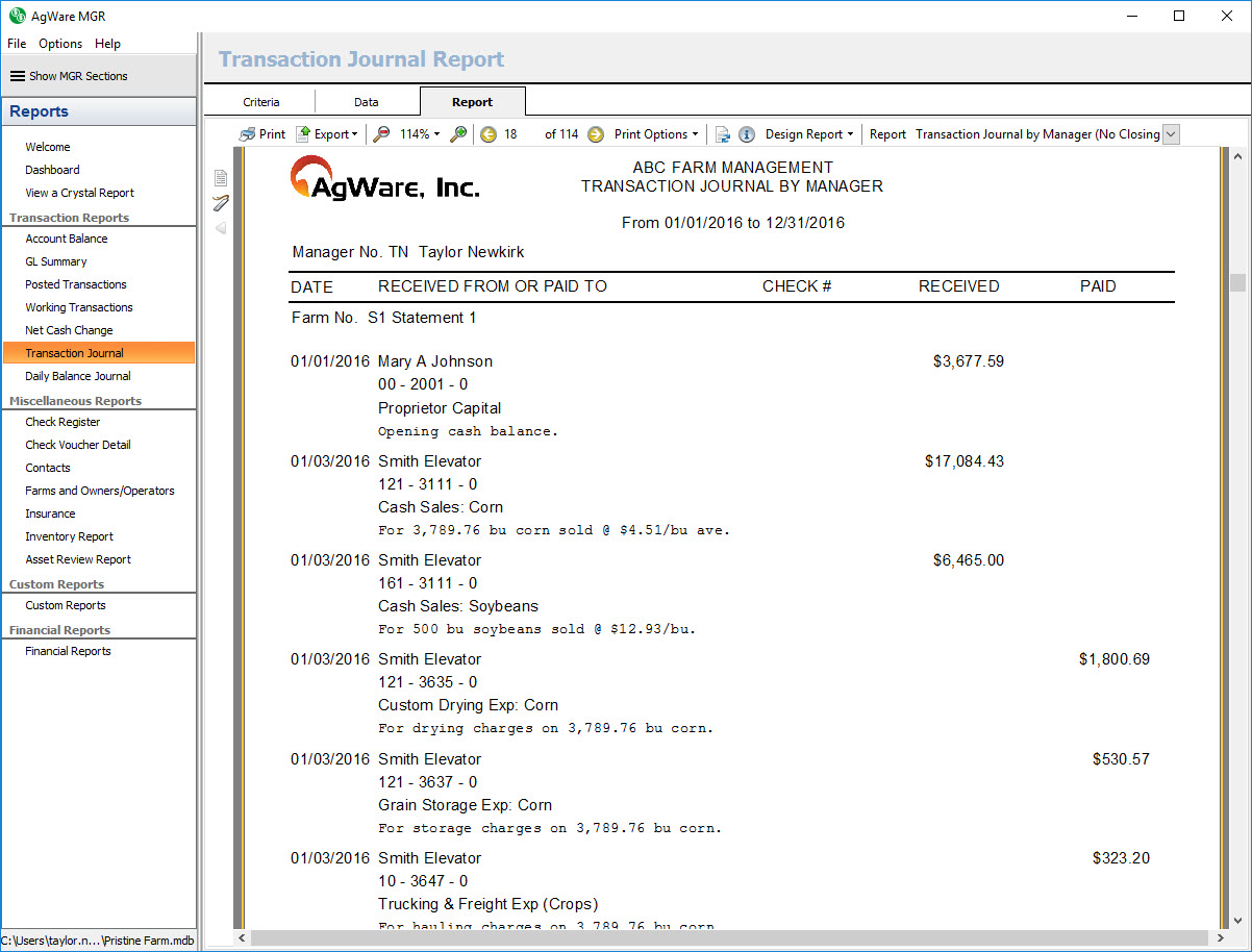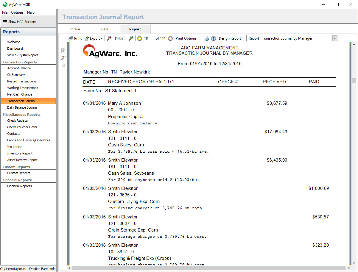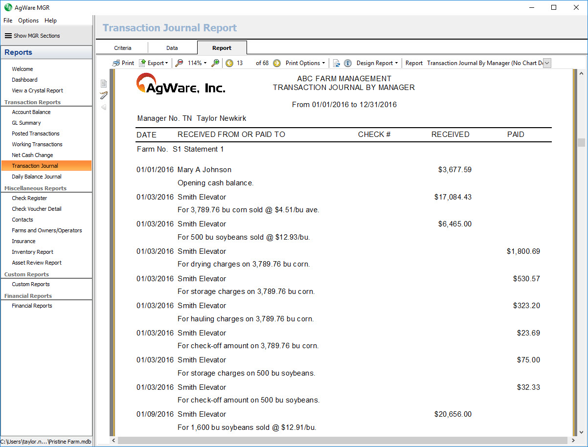 The transaction journal by manager report shows a listing of all posted transactions within the chosen date range for the selected farms sorted by manager, then farm, then transaction date.