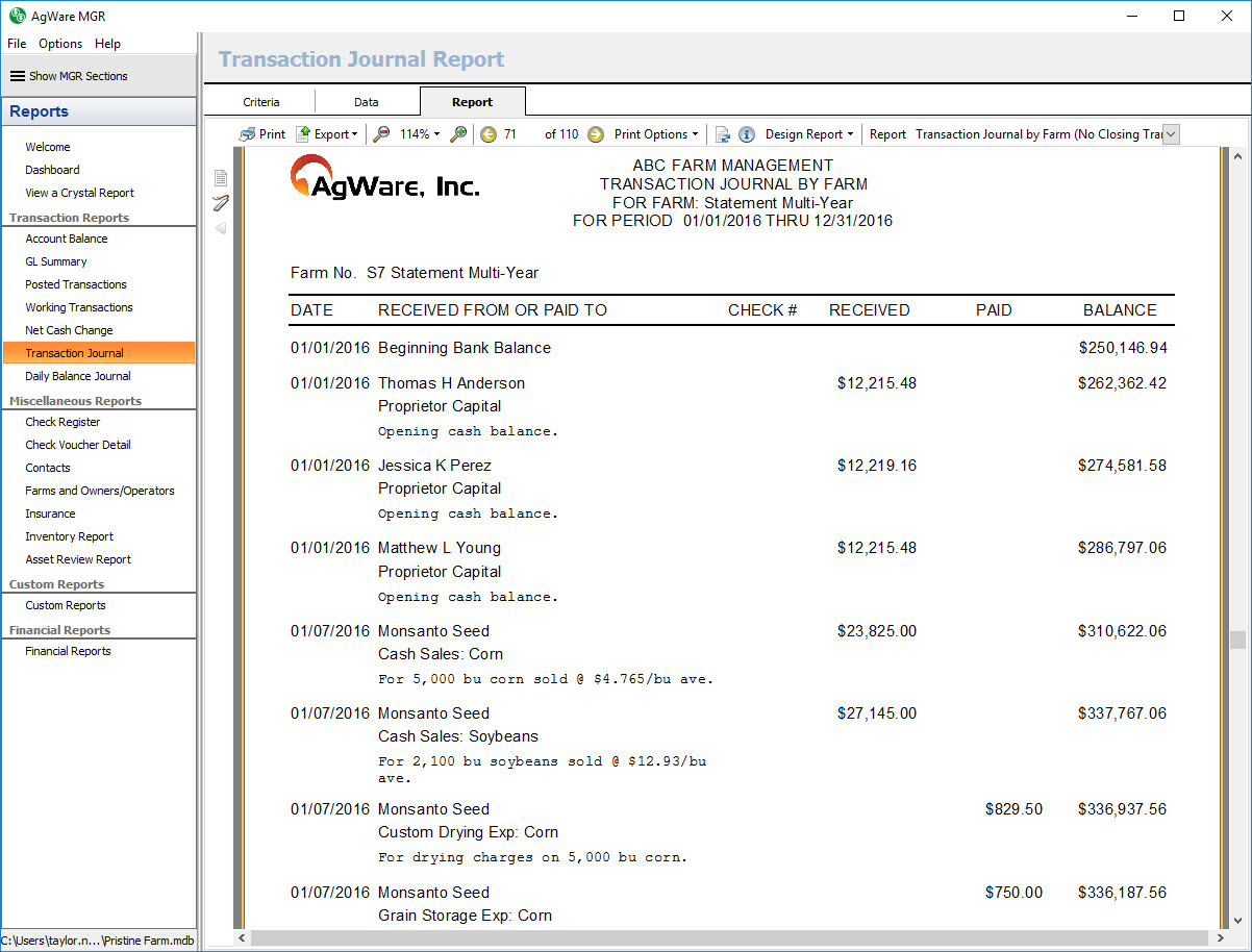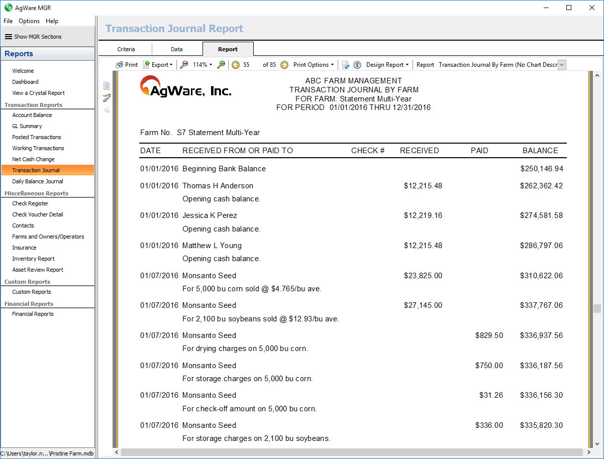 The transaction journal by farm report shows a listing of all posted transactions within the chosen date range for the selected farms sorted by transaction date.