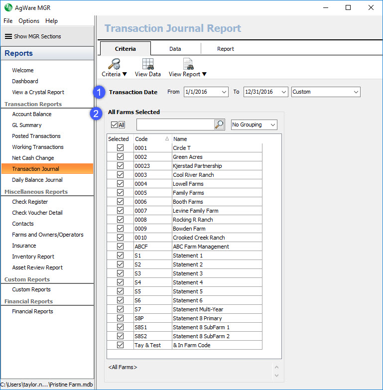 The transaction journal report section contains eight system reports: Transaction Journal by Farm (No Chart Description), Transaction Journal by Farm (No Closing Transactions), Transaction Journal by Farm (No Closing, No Chart Description), Transaction Journal by Farm, Transaction Journal by Manager (No Chart Description), Transaction Journal by Manager (No Closing Transactions), Transaction Journal by Manager (No Closing, No Chart Description), and Transaction Journal by Manager. The criteria screen for the transaction journal report section contains transaction date selectors (1) and a farm selector (2). You’ll choose the desired from date and to date (you can also use the date range drop down that will auto fill the from and to dates). Then, you’ll select your farms. All transaction journal reports only show posted transactions. Each report shows a beginning and ending cash balance for each farm. For each transaction listed, the report also gives a running cash balance to show how that transaction affected the cash balance.