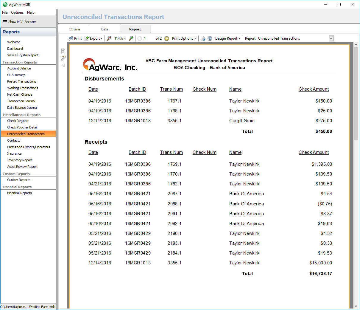 The unreconciled transactions report shows a list of all unreconciled transactions for the selected bank account sorted by type (disbursement or receipt), date, batch id, then transaction number.