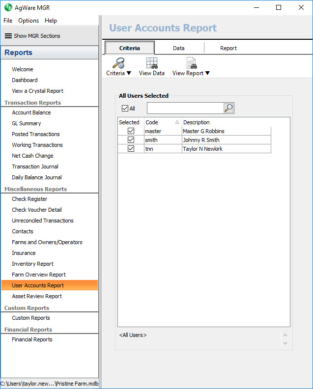 The User Accounts report section contains one system report: User Accounts Report. The criteria screen for the User Accounts Report section contains a user selector. Simply select the desired users.